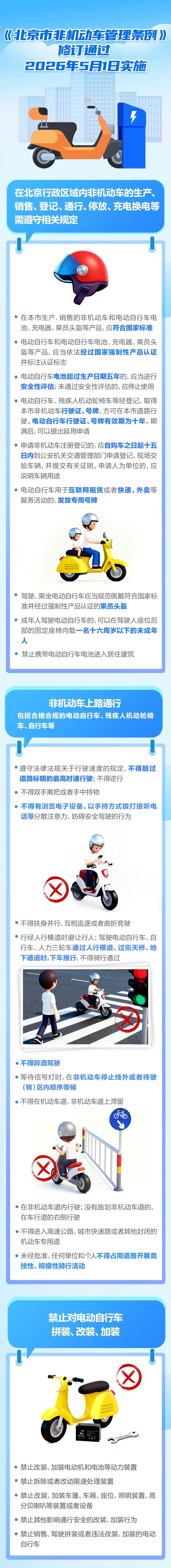 今天(28日),新修订的《北京市非机动车管理条例》经北京市第十六届人民代表大会常务委员会第二十次会议表决通过,自2026年5月1日起施行。